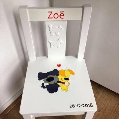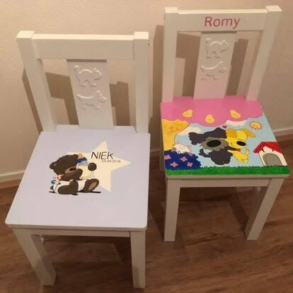 Kinderstoeltjes naar wens laten maken. Geef bij het afrekenen aan wat je graag op je stoeltje wilt hebben. Of app of mail voor de mogelijkheden