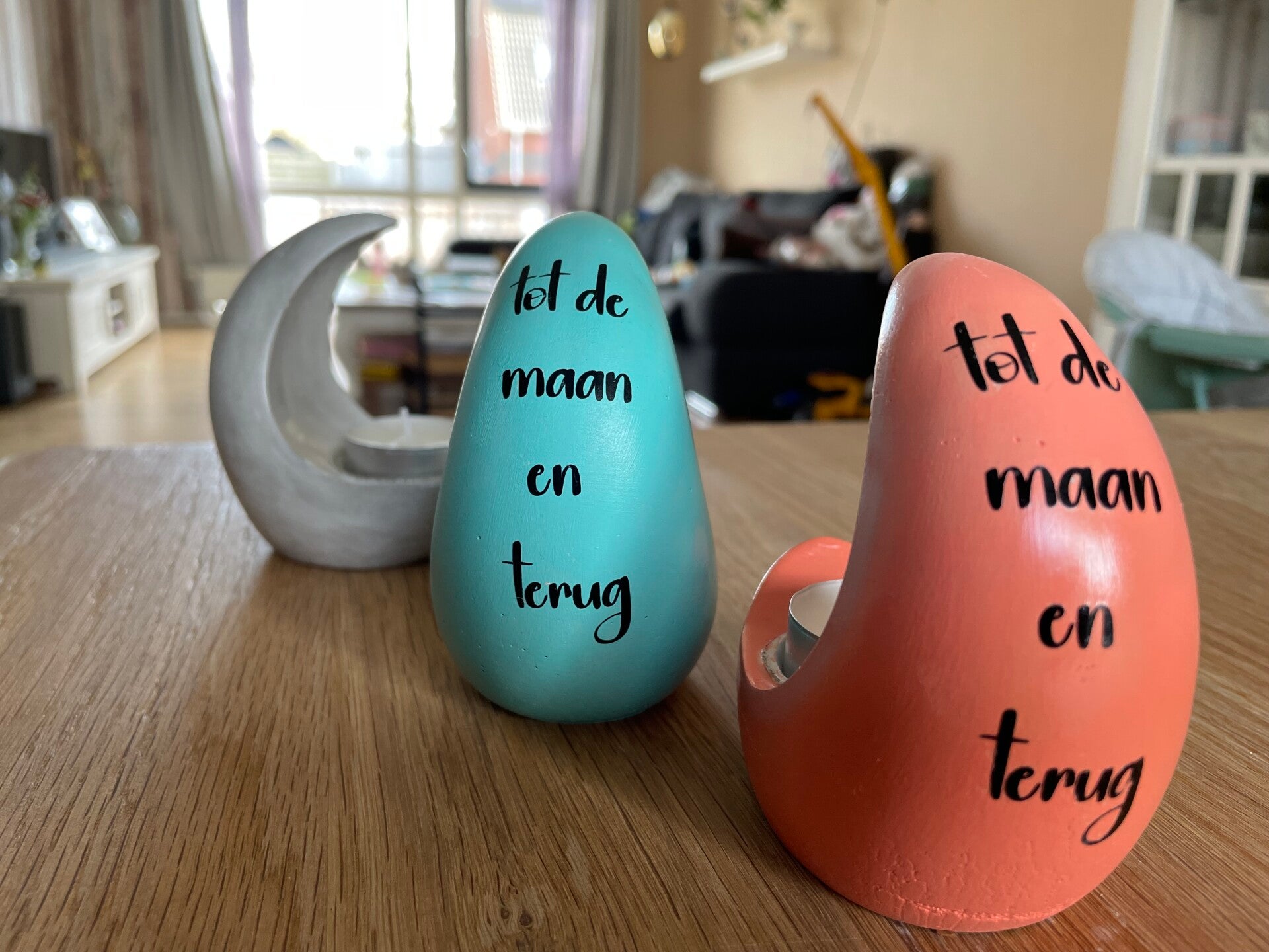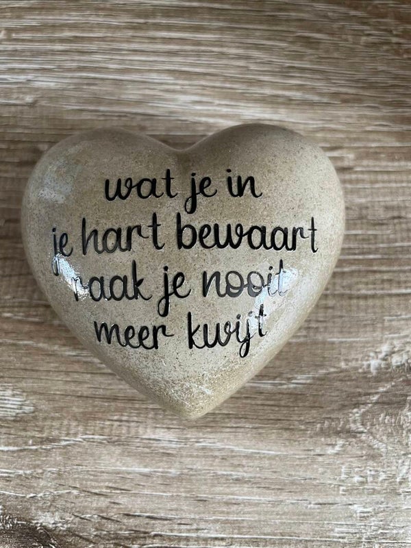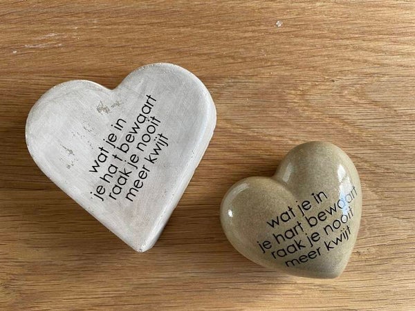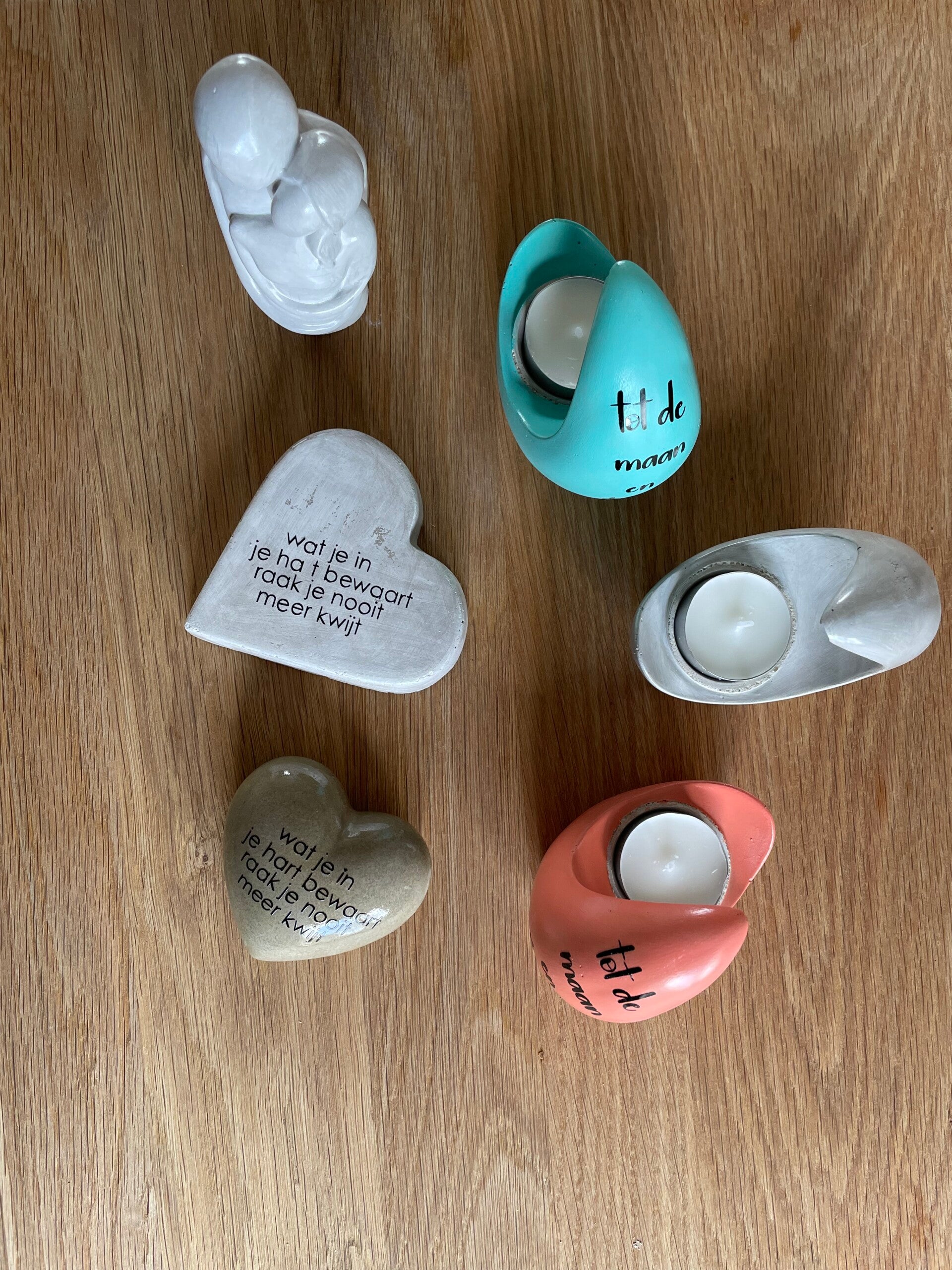 Betonnen beeldjes met of zonder tekst. De beeldjes zijn van beton gegoten en afgewerkt met een lak laag zodat ze buiten kunnen staan.